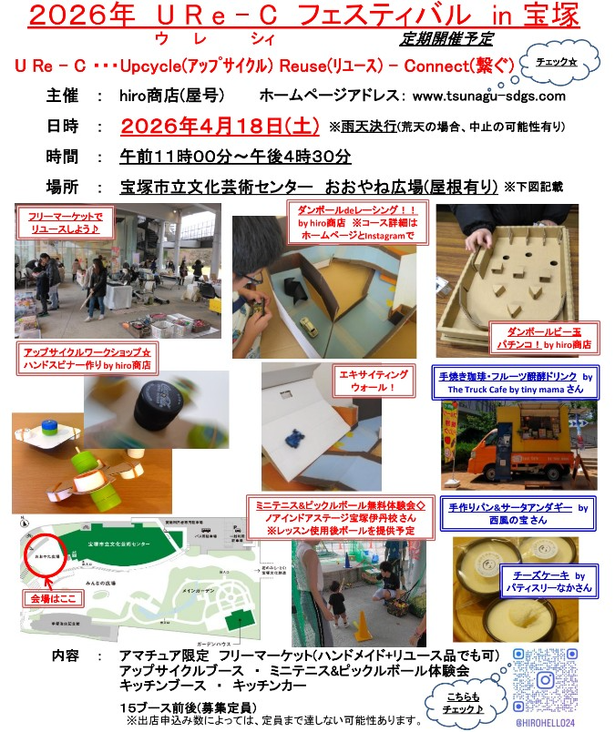 昨年は、『URe-C(ウレシィ)※フェスティバル in 宝塚』『URe-C(ウレシィ)※フェスティバル in 猪名川』に名称を変更して、リユース(フリーマーケット)とアップサイクルをメインにイベントを開催させて頂きました🎪リユース品の新規出店者に加えて、無料ミニテニス&ピックルボールやキッチンカー,キッチンブースも多数参加してくださり、ありがとうございました🙇♀ホームページやInstagramを閲覧して来場したり、出店もしたいなと言ってくださった方もおられ、新たな出会いもあって嬉しかったです🤗