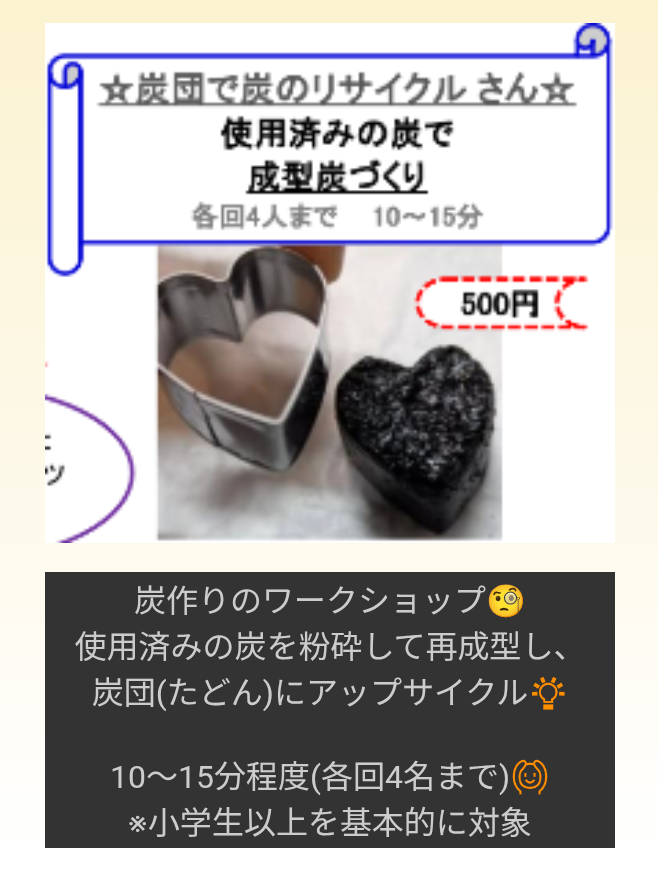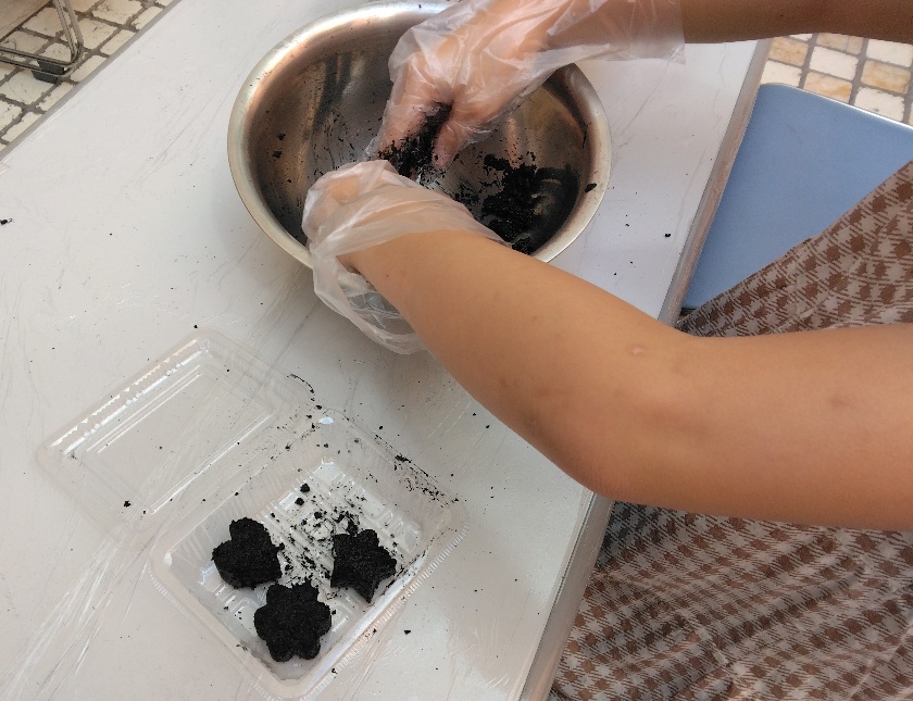 ☆炭団で炭のリサイクル さん☆の炭作り(ワークショップ)✂️では、使用済の炭を一生懸命こねこねして、選んだ型に炭を成型して炭団(たどん)を作ってくれていました💃出来上がったアップサイクル品の出来栄えも気になりますが、製作過程も大事なポイントで楽しく作業してくれていましたね😊