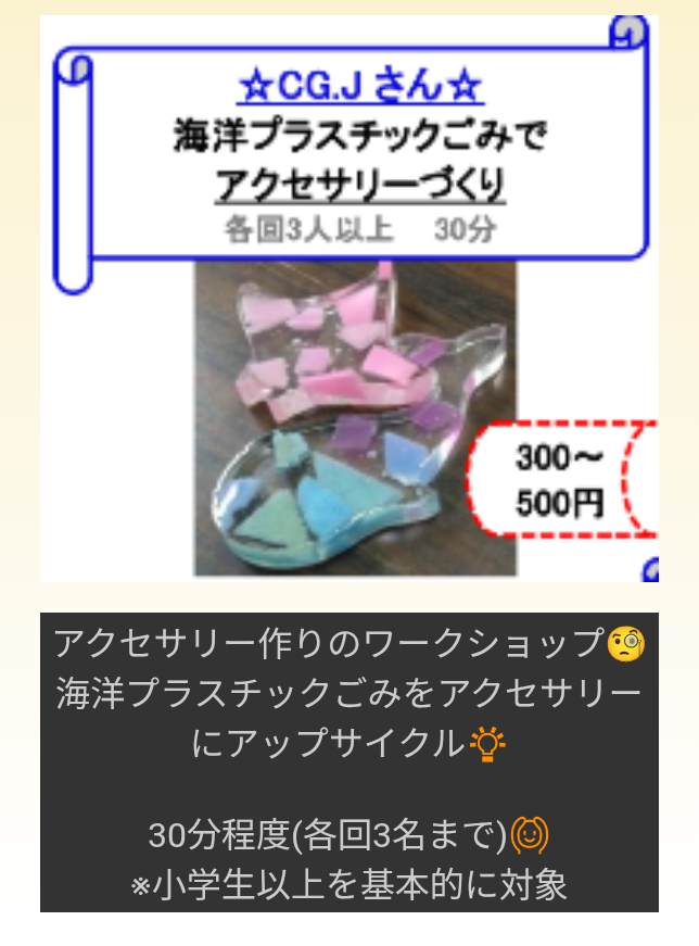 ☆CG.J さん☆のアクセサリー作り(ワークショップ)✂️では、海洋プラスチックごみをアップサイクルして自分だけのオリジナルのアクセサリーを作ってくれました💍海洋プラスチックごみの問題を真摯に捉え、定期的に海岸でゴミ拾いをされている活動に関心を持たれた方もおられ、環境問題,SDGs 17の目標について考えるきっかけになれば良いですね😌