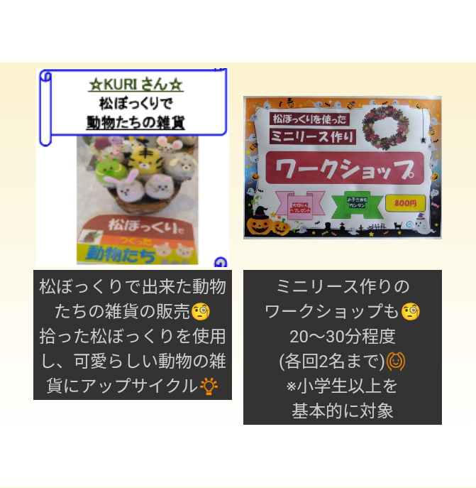☆KURI さん☆の松ぼっくりで出来た動物の雑貨(販売)📦ミニリース作り(ワークショップ)✂️では、松ぼっくりやドングリをアップサイクルしてリースを作ってくれました✴好きなだけ材料を使って良いそうで、子どもたちがグルーガンで自由にデコレーションしていましたね✨