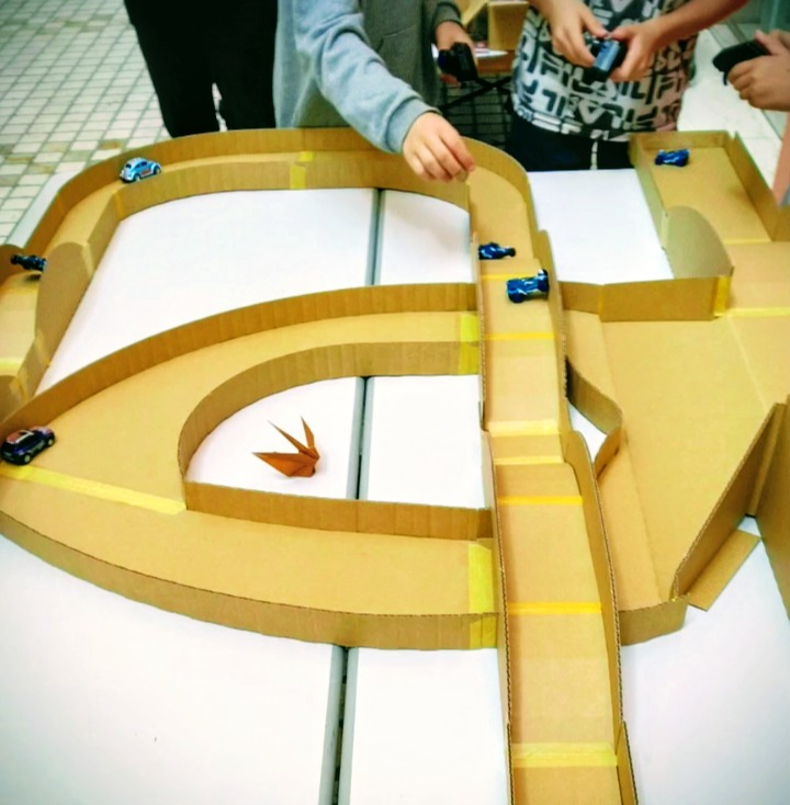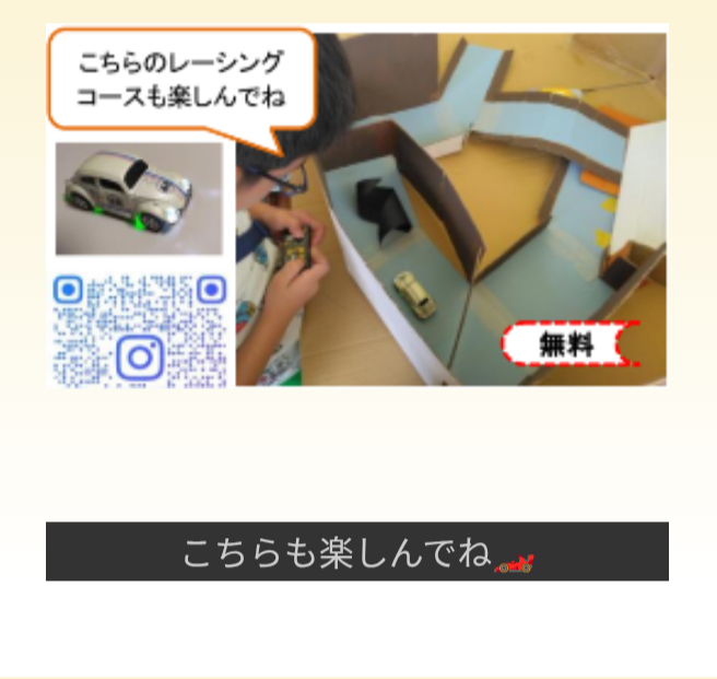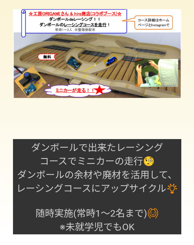 ダンボールコースでミニカー走行(体験)💃は、工房ORIGAMIさんとのコラボコースとhiro商店自作コースの2種類を体験してもらいました。レーシングカー,乗用車,レトロタイプの3種類のミニカーを準備🏎レーシングカーは馬力あり急旋回が出来て、乗用車はアライメントを付けてやや小回りし易いようにしており、レトロはライト点灯するのと自動運転もします。いつの間にか人だかりで、開催時間中ほぼ満員御礼で、多めにミニカーを準備していましたが、充電が追いつかずでした😅自作コースの関門の一つの《ブラックホール》が、クリア出来なかったからかいつの間にか剥がされていたのは😵でしたが、楽しんでくれたなら良かったです😌ミニ四駆と違い自分で操作出来るミニカーにも興味を持ってくれて、ダンボールでこんなコースが製作出来ることに関心もして頂きました😀