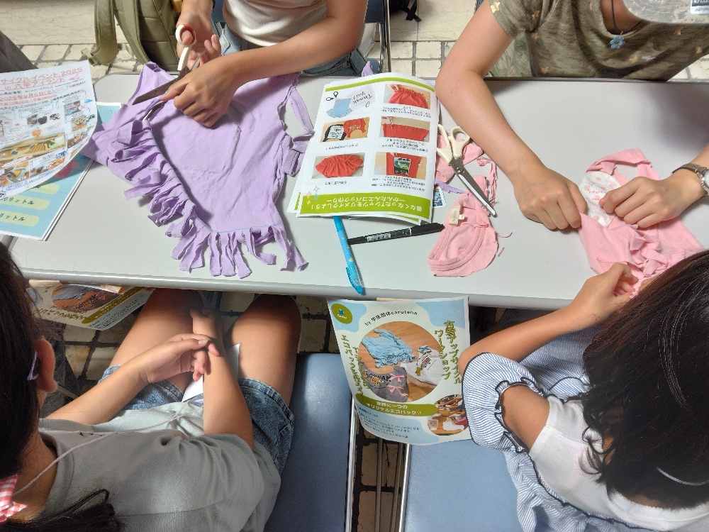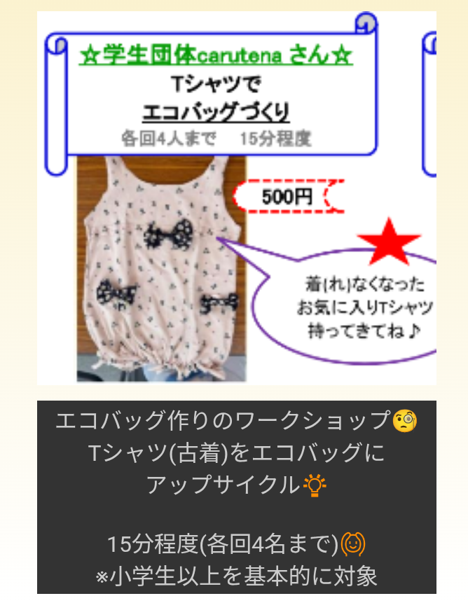 ☆学生団体carutena さん☆のエコバッグ作り(ワークショップ)✂️では、着(れ)なくなったTシャツ等をアップサイクルして、お気に入りのエコバッグを作ってくれていました👕いました😀事前に開催案内チラシで呼びかけをしたこともあり、参加者の子どもがご家庭のTシャツ(古着)を持ってきてくれたのが嬉しかったです🤗