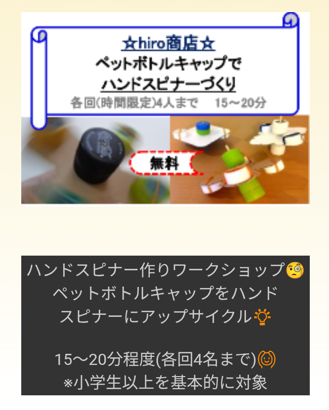 ハンドスピナー作り(ワークショップ)✂️では、計5人(累計53人)の方にワークショップを楽しんでもらい、個性のある素晴らしい作品たちと出会うことが出来ました🤗イベント全体を統括しないといけない為、時間を区切ってでしたが、小学生に未就学児とアップサイクルに触れてもらえて嬉しかったですね😃さらに、色んな方々と一緒にハンドスピナーを作りたいと思っております😌