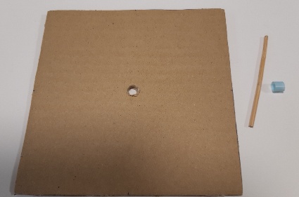 ②段ボール等(約10×10cm,中央に穴開け),竹串等(約6.5cm),ストロー等(約1cm)を用意する