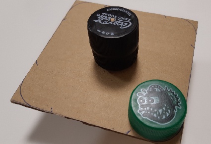 ⑥四隅にキャップを置き、それに沿って線を引き、キャップ中央の延長線と段ボール等各辺の交差点に線を引く
