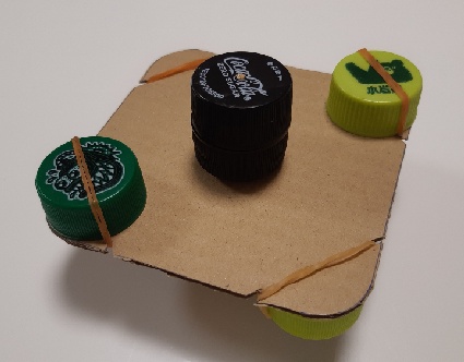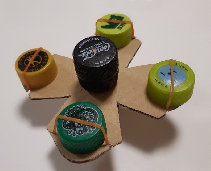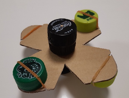⑧ ⑦の切込みに輪ゴム等を引っ掛け、キャップを段ボールとの間に挟む※画像は交互に上下でキャップを配置