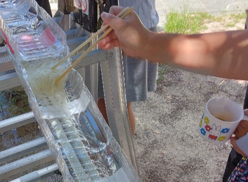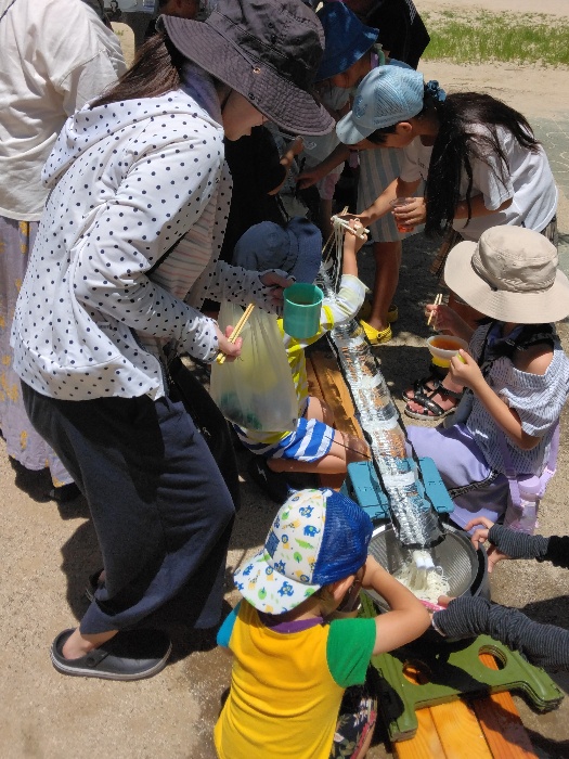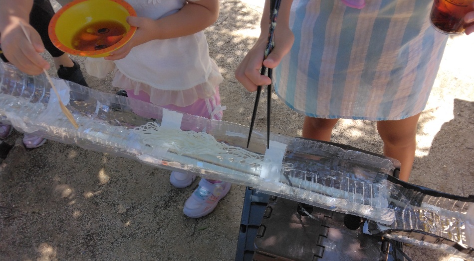 まだかまだかと子どもたち👦👧準備完了して、さあ流しそうめんスタート🙋上手くペットボトルを連結し、高低差を支柱を使って調整され、そうめんがスムーズに流れるようになっていました🧐そうめんをすくうのにみんな夢中、楽しく美味しそうにそうめんを親子で食べていました😋そして、締めはミニトマト🍅大きいものがありましたが、流れてくれて、子どもたちも喜んでいました😀