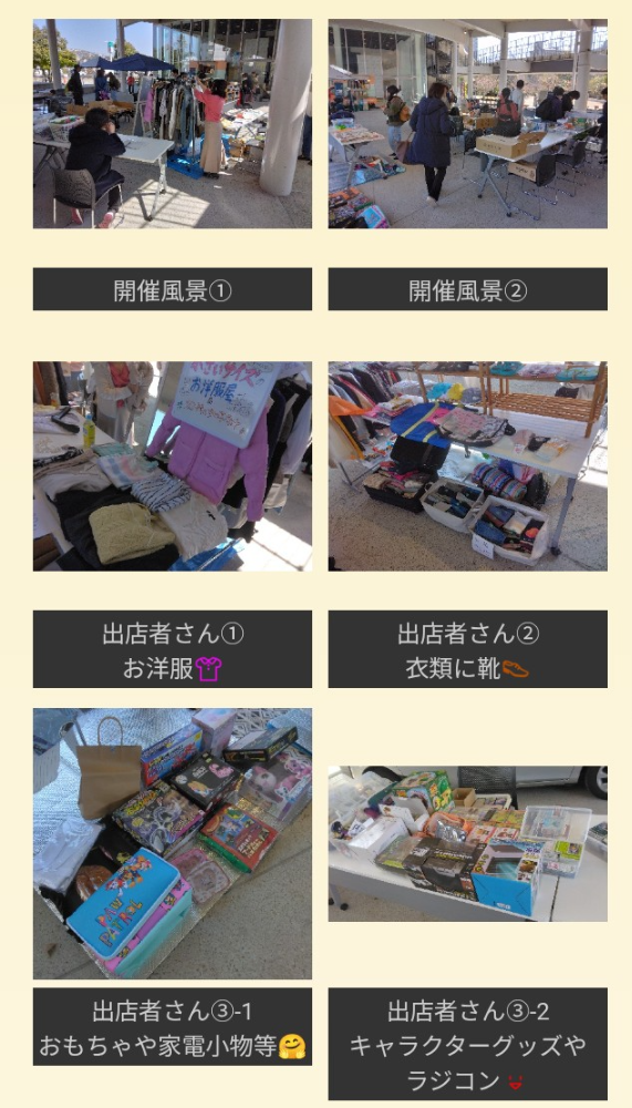 宝塚市立文化芸術センターへの来場も含めてになりますが、昨年11月より多い700名以上の来場者数(確認出来る範囲)となりました👏今回のフリーマーケットは、新規出店者さんも来られて色んなリユース品の出店がありました✨フリーマーケット開始からたくさんの方が来場され、前回もお越し頂いた方やフリマ目当ての方も来場されていました😃リユース品をお話ししながら、楽しく手に取られていましたね🤗