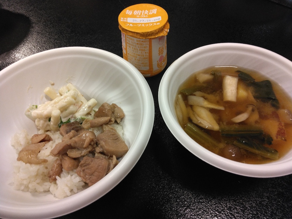 本日のメニューは、焼き鳥丼🍜にキノコの味噌汁🍄とゴマ風味マカロニサラダ🥔でした🍴デザートにヨーグルト😊今回も、美味しく頂かせてもらいました😋
