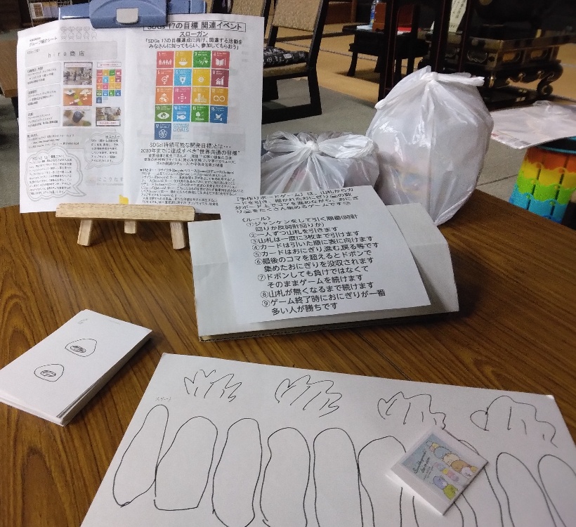 今回も、約17名の子どもたちや大人の方に、手作りボードゲームで遊んでもらいました😊4,5人で対戦し、今回は獲得したおにぎりの多い子どもにお菓子セット等をプレゼント🎁何枚カードを引くか考えながら、白熱バトルが繰り広げられました❗❔プレゼントGET❕