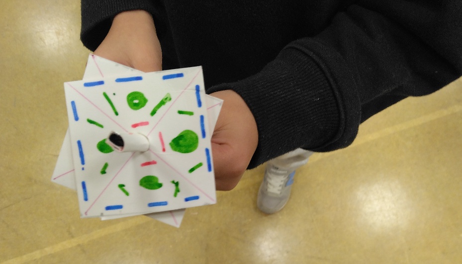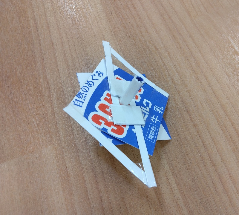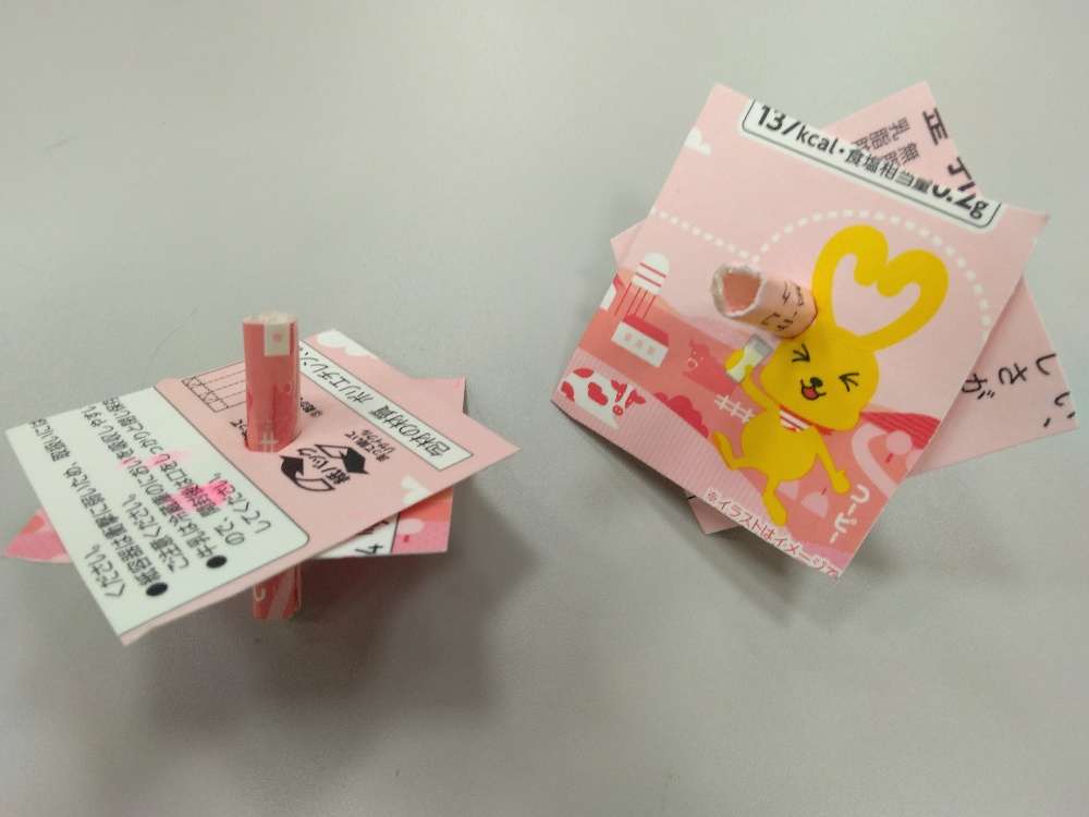 牛乳パックの内面の白を使って、色や柄を塗り書きしてくれた子どもだけでなく、ハネの部分に残りの部材を用いてオリジナルのコマを作ってくれました✨